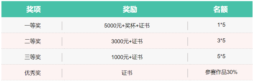 吉祥物设计组、包装设计组、空间组、产品组和文创组共5个组别分别设立一二三等奖和优秀奖若干,奖金总金额为10万元,具体名额和奖金分配如下: